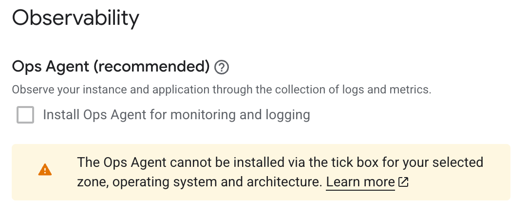 During instance creation, you will notice the Observability - Ops Agent section near the bottom of the configuration page. For supported operating systems, this provides a convenient Install Ops Agent for Monitoring and Logging checkbox that automatically installs the agent when the VM boots. However, with openSUSE Leap 16.0 selected as the boot disk image, this checkbox is greyed out and displays the message: "Not available for the selected image." This is because the automated installation method does not yet support Leap 16.0.