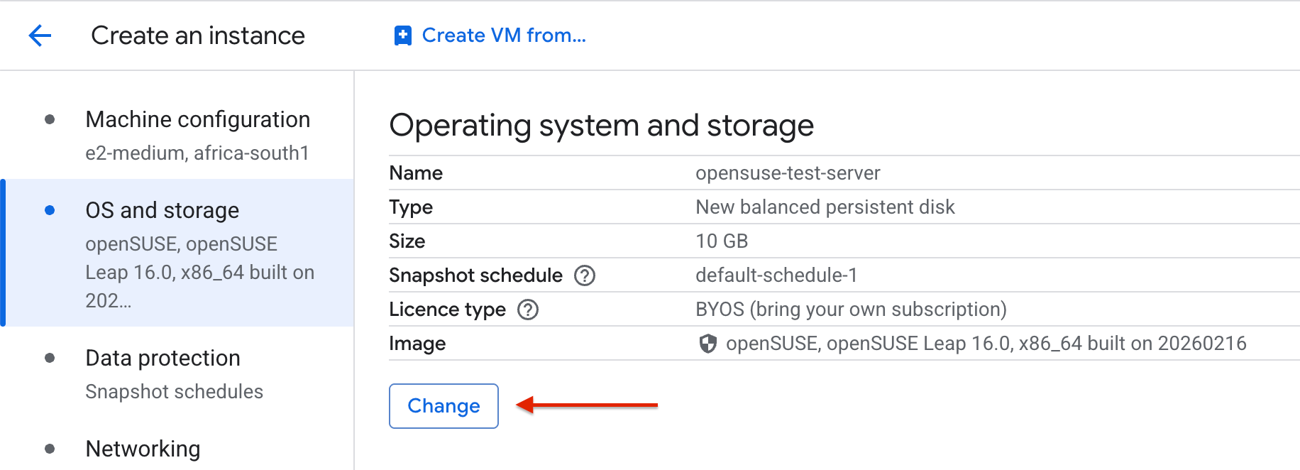 From there, configure the rest of your instance settings — machine type, networking, firewall rules — as you normally would, and click Create to launch your new Leap 16.0 VM.