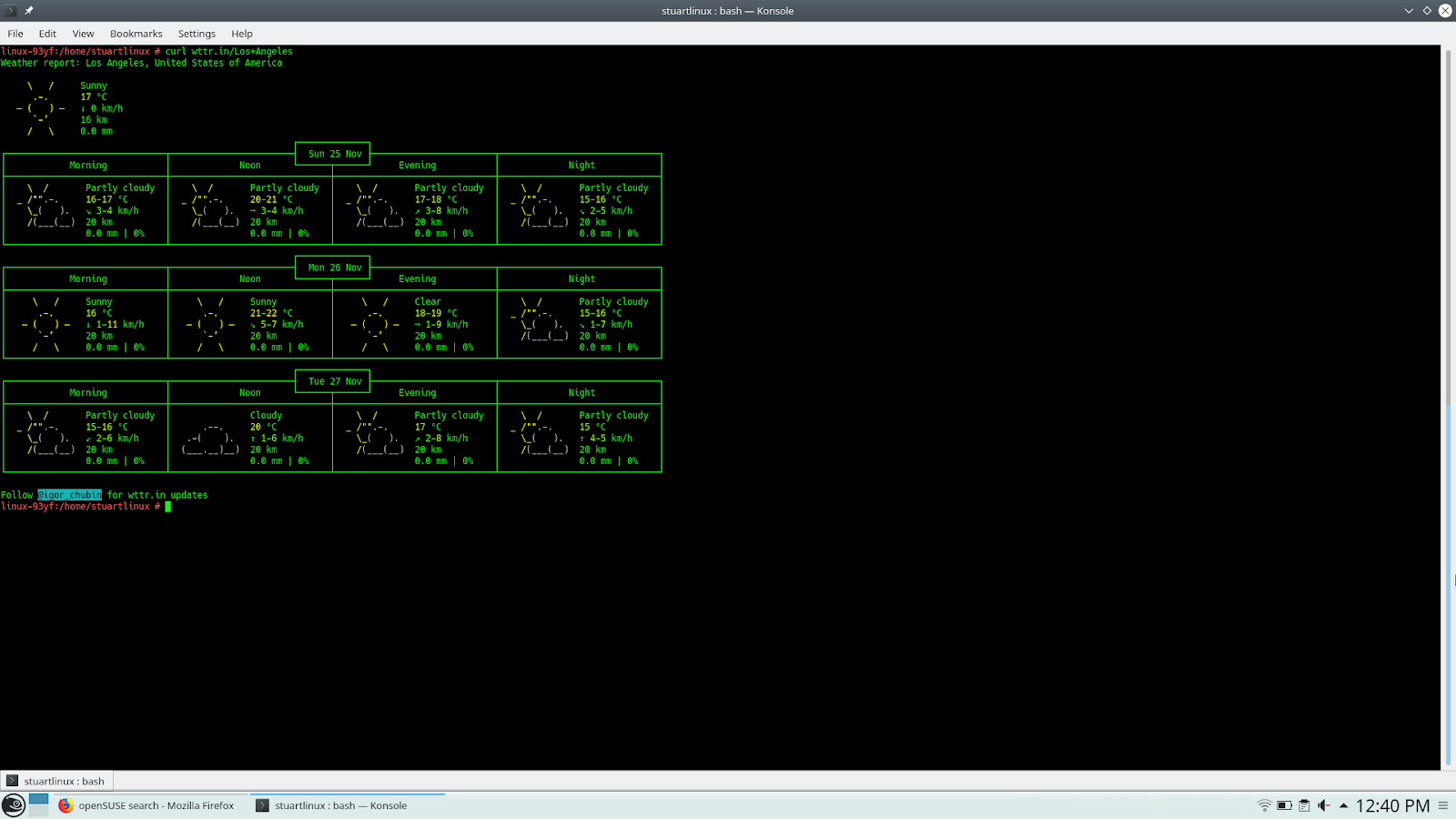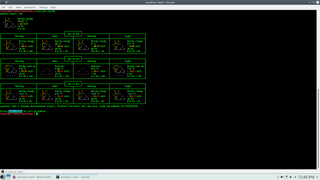 Ahora, si deseamos el pronóstico del clima en una ciudad diferente, podemos especificarlo con una barra al final de wttr.in. Reemplazamos cualquier espacio en el nombre con un +