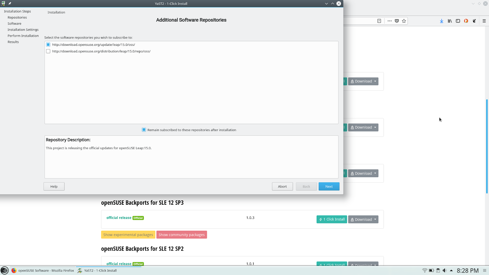 seleccionamos la versión de openSUSE que estemos utilizando y llevamos acabo el proceso de instalación con la opción One Click Install