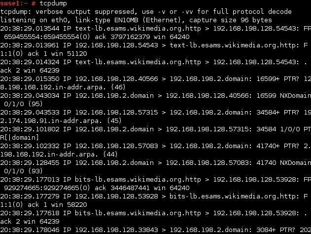 Tcpdump diagnostica las redes TCP/IP y su resultado final o salida del comando los presenta en formato legible, comúnmente denominado sniffer. No es intrínsecamente peligroso, y es de gran utilidad para los administradores de redes que necesiten ver el tráfico para poder buscar problemas en una red. Soporta operadores booleanos de búsqueda y puede utilizar nombres de host , direcciones IP, nombres de red, y protocolos como argumentos.