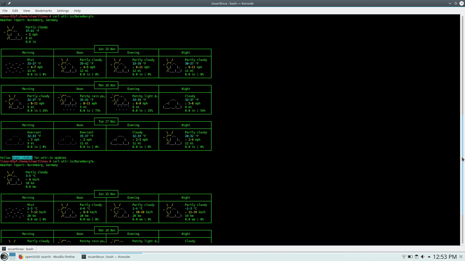 Por defecto, wttr.in mostrará las temperaturas en las unidades (C o F) utilizadas en nuestra ubicación real. Básicamente, en Estados, obtendrás Fahrenheit, y en todos los demás se presentará en Celsius (Centígrados). Puedes cambiar eso agregando? U para ver Fahrenheit o? M para ver Celsius.